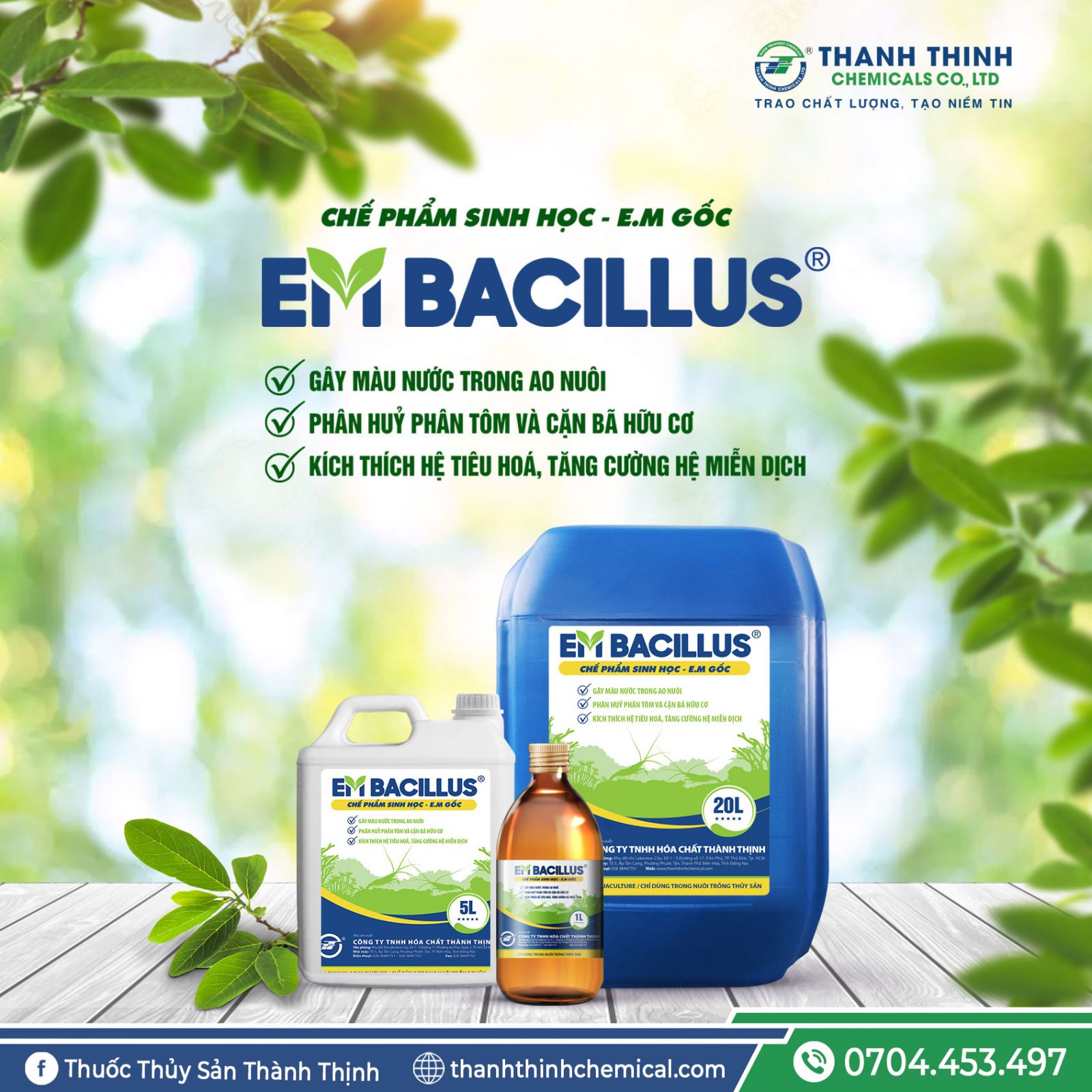 Men vi sinh EM Bacillus có tác dụng phân hủy mùn bã hữu cơ, thức ăn thừa nhanh chóng, phát triển hệ vi sinh vật có lợi để ức chế sự phát triển của tảo có hại đồng thời giảm ngay nồng độ khí độc trong ao để áp dụng các biện pháp xử lý tạo hiệu quả và an toàn cho tôm. bảng giá thức ăn nuôi tôm