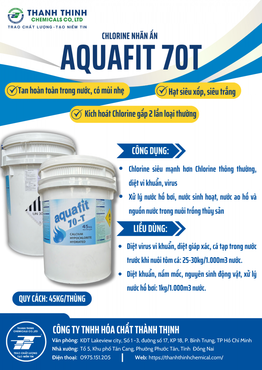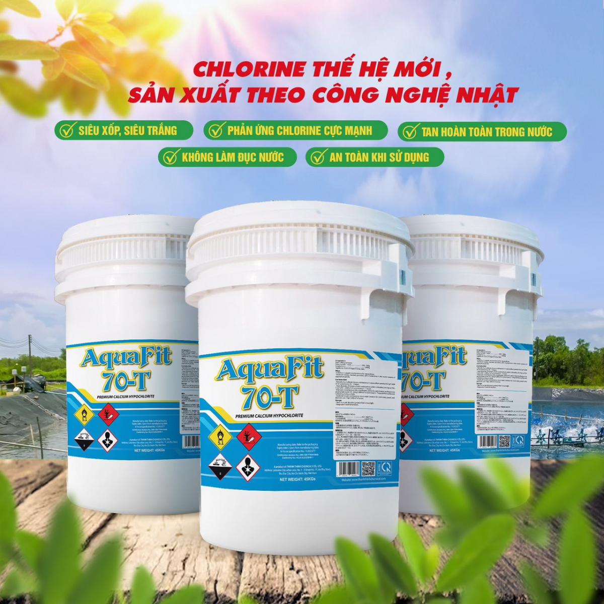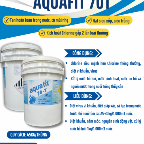 AQUAFIT 70-T - Chlorine thế hệ mới, sản xuất theo công nghệ Nhật, siêu xốp, siêu trắng, phản ứng chlorine cực mạnh, tan hoàn toàn trong nước " Diệt virus, vi khuẩn, kí sinh trùng, mầm bệnh, xử lý nguồn nước "