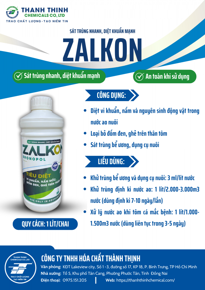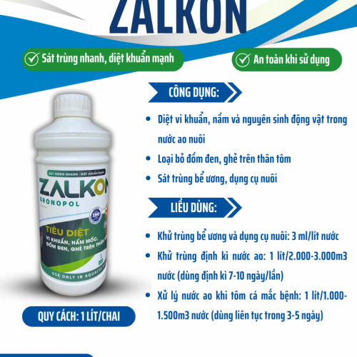 ZALKON® - Diệt virus, vi khuẩn, loại bỏ đốm đen, ghẻ trên tôm, sát trùng bể ương, dụng cụ nuôi